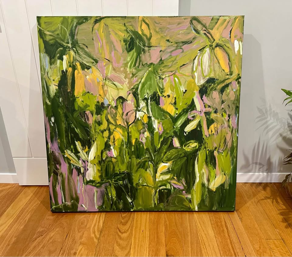 The composition is dense and layered, with flowers and foliage overlapping in a rhythmic, almost musical way. There’s a raw, emotional quality to the mark-making—loose yet intentional.