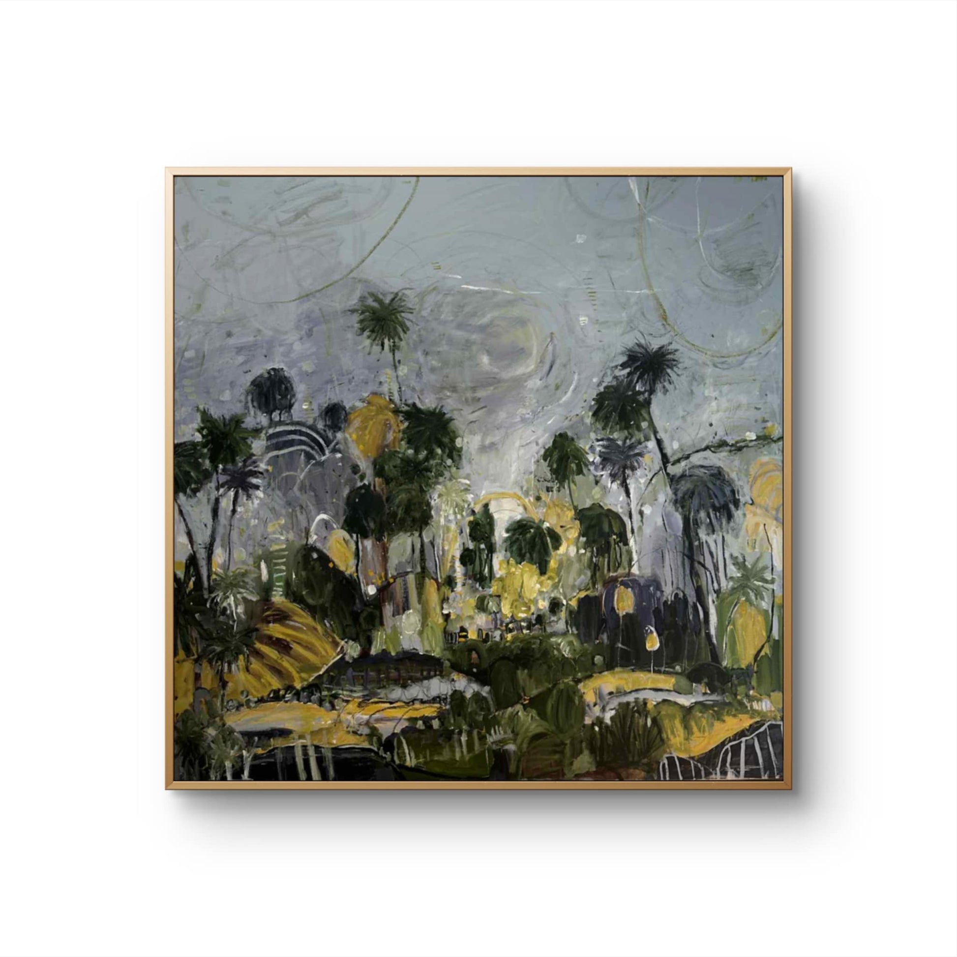 This painting blends moody blue-greys, lush greens, and bursts of golden yellow to create a dreamy, jungle-like atmosphere. Step inside and lose yourself in its quiet wonder—a world of beauty, mystery, and serene escape.