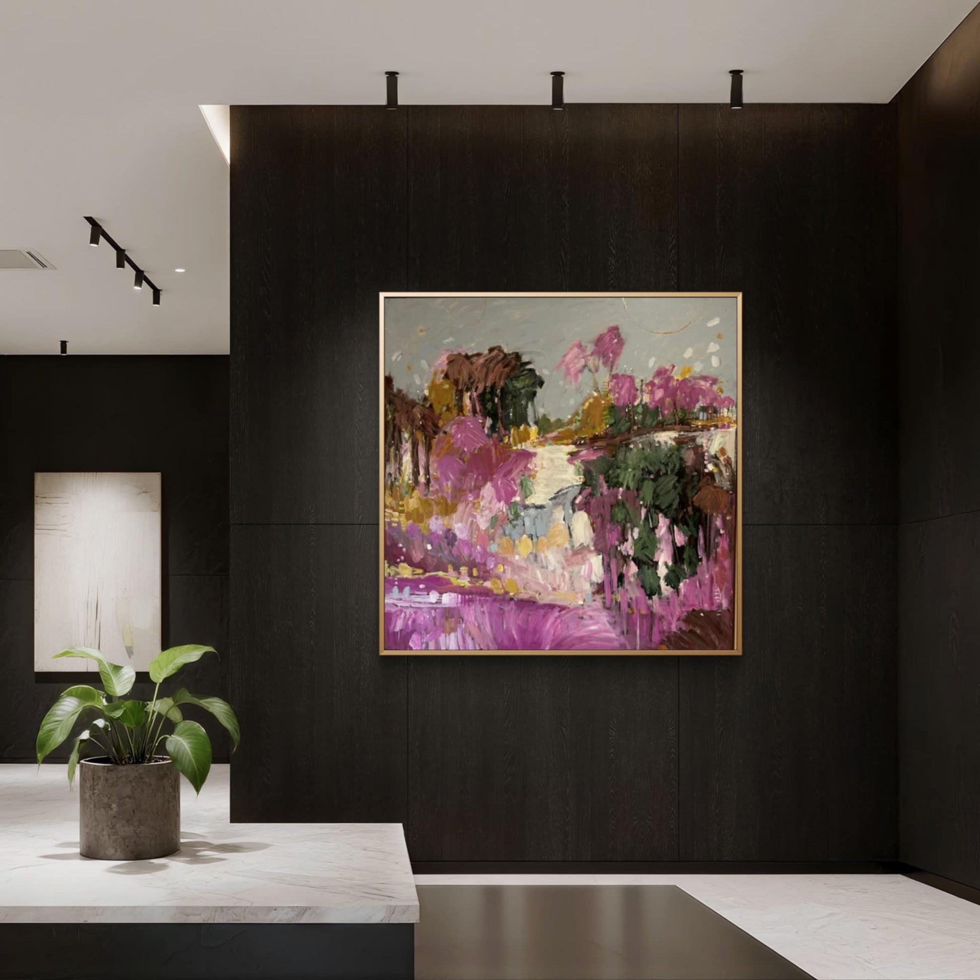 Wild Bloom is a bold abstract landscape that captures the spontaneous beauty of nature in full flourish. With dynamic brushwork and a rich palette of deep magentas, lush greens, golden ochres, and soft greys, this piece evokes a dreamlike garden scene where colour and emotion run wild.